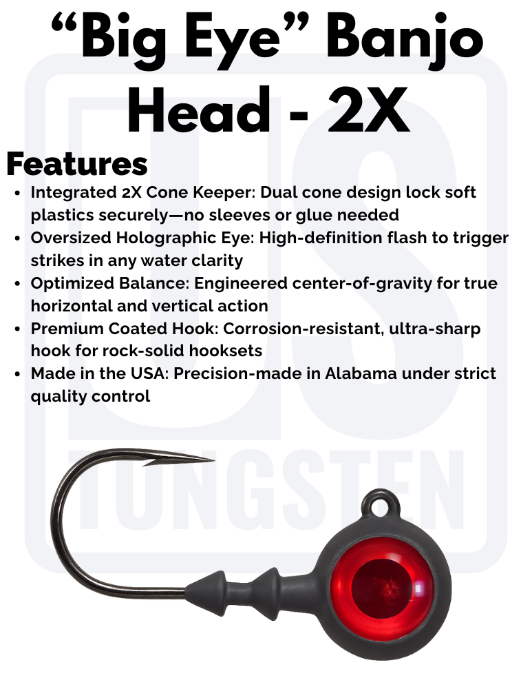 Engineered for anglers who prefer a streamlined keeper system without helical screws, our Big Eye Banjo Head now features a dual-cone “2X Cone” keeper design. Molded directly into a 97% tungsten body, the two precision-angled cones grip soft plastics securely at optimal spacing—locking in your favorite swimbaits without tearing or pinch points. The oversized 8 mm holographic eye delivers unmatched flash, while the optimized center-of-gravity ensures flawless tracking in both horizontal and vertical retrieves. Available in four sizes, each 2-pack includes a premium VMC PTFE-coated hook for razor-sharp penetration and superior corrosion resistance. Proudly designed and molded in the USA for anglers who demand performance and reliability.