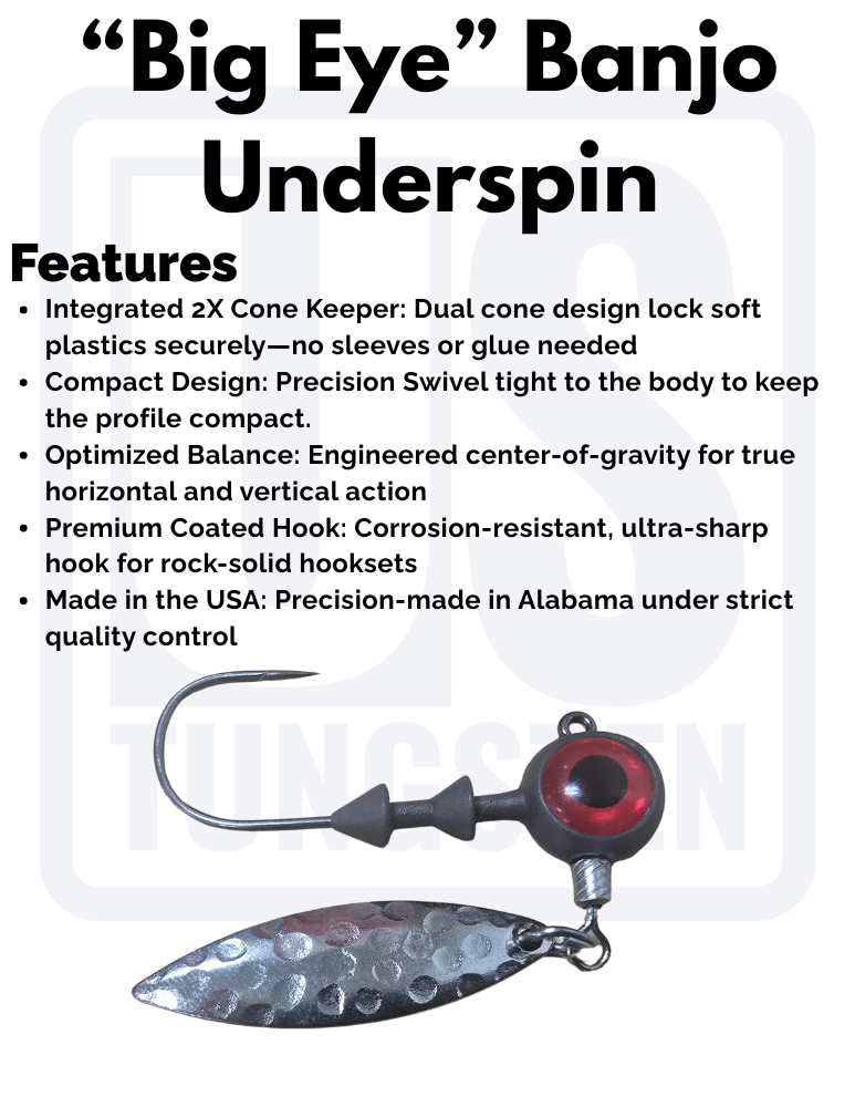 Experience the ultimate fusion of flash and finesse with our Big Eye Banjo Underspin, now featuring the streamlined 2X Cone Keeper system. Molded from a 97% tungsten compound, two precision-angled cones secure your soft plastics without tearing—no sleeves or glue needed. The free-spinning blade creates erratic flashes and pressure pulses, while the oversized 8 mm holographic “Big Eye” maximizes attraction. Engineered center-of-gravity ensures true tracking and snag-shedding performance on both horizontal sweeps and vertical drops. Each 2-pack includes a premium PTFE-coated hook for razor-sharp hooksets and superior corrosion resistance. Proudly designed and molded in the USA for anglers who demand cutting-edge gear.