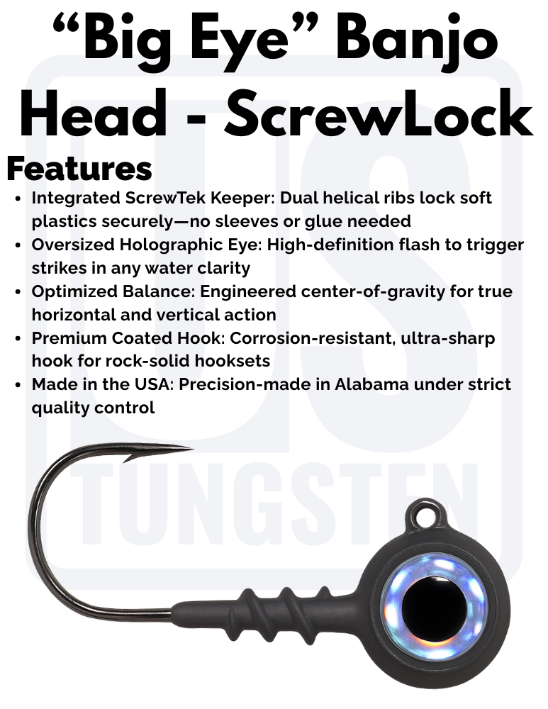 Engineered for pro anglers who demand maximum bait retention, sensitivity, and flash. The Big Eye Banjo Head features our patent-pending ScrewTek keeper system molded directly into a 96% tungsten body—no sleeves or glue to fail. An oversized holographic eye and precision-balanced profile ensure lifelike action in both horizontal and vertical retrieves. Proudly made in the USA.