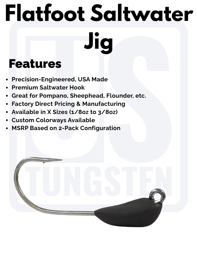 Dominate the toughest saltwater spots with our Flatfoot™ Jig. Engineered from 97% tungsten for ultimate sensitivity and a low center-of-gravity, it excels at vertical drops under oil rigs, dragging live bait through rocks for sheephead, or skimming sandy flats for flounder. A saltwater-grade, chemically sharpened hook ensures rock-solid hookups, while the flat underside sheds snags and keeps baits perfectly presented. Available in multiple sizes and custom colorways, each 2-pack is fully OEM-ready and proudly molded in the USA.